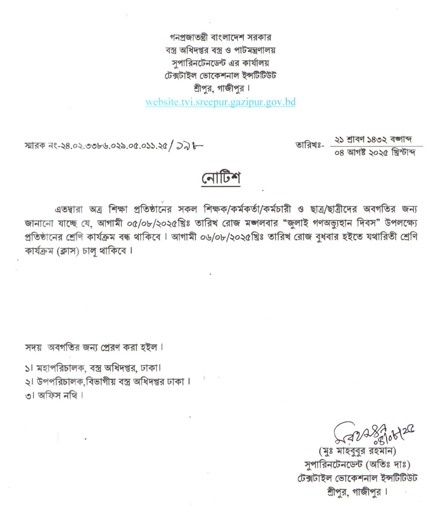 | ১০ | পবিত্র আশুরা উপলক্ষে ছুটি | | | ০৩-০৭-২০২৫ | দেখুন |
